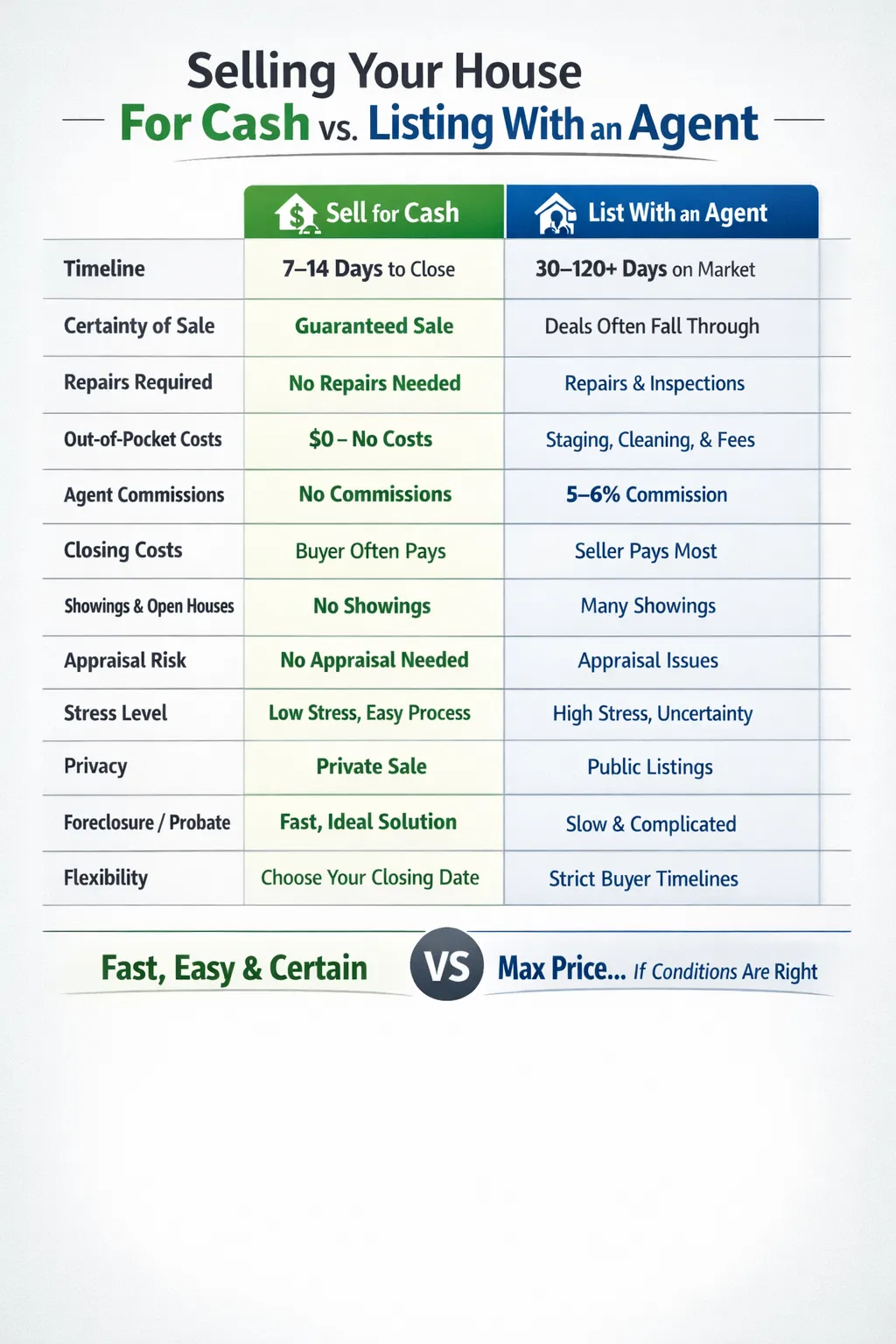 Agents list your home and hope it sells. We buy it directly. No showings, no repairs, no months of waiting, and no deals falling apart because of financing.